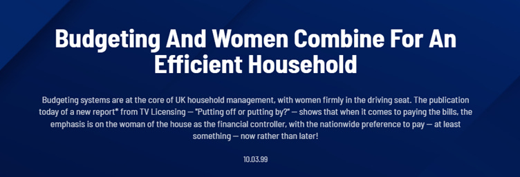 But legal equality didn’t mean decision making parity, and brands and policymaker assumptions about household spending remained – perhaps remains – highly gendered. This report title from Ipsos and the TV Licensing Authority is from 1999 and hasn’t aged well (write up available on the Ipsos website here).